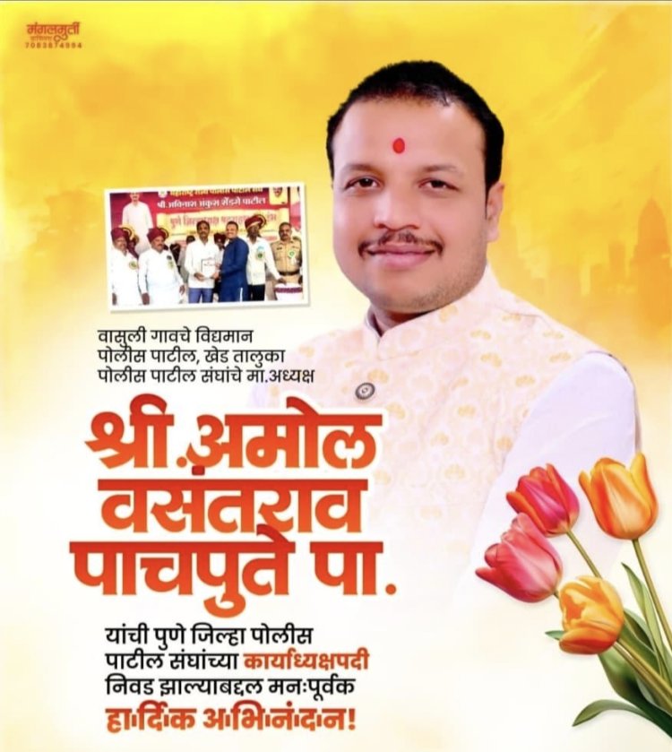पुणे : खेड तालुक्याचे सुपुत्र, वासुली गावचे पोलीस पाटील तसेच खेड तालुका पोलीस पाटील संघांचे माजी अध्यक्ष अमोल वसंतराव पाचपुते यांची पुणे जिल्हा पोलीस पाटील संघाच्या कार्याध्यक्षपदी निवड करण्यात आली आहे.