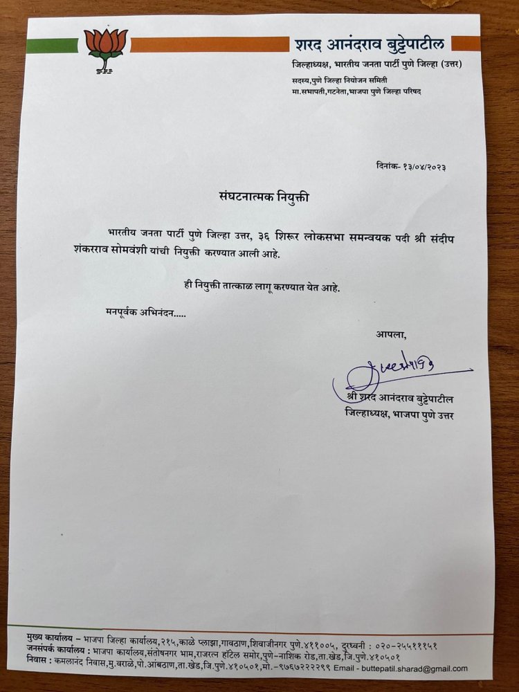 भारतीय जनता पार्टीच्या उत्तर पुणे जिल्हा शिरूर लोकसभा समन्वयक पदी संदिप सोमवंशी यांची नियुक्ती...!